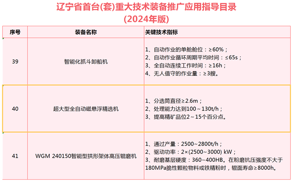 日前,遼寧省工業(yè)和信息化廳正式公示了2024年遼寧省首臺(套)重大技術(shù)裝備推廣應(yīng)用指導(dǎo)目錄。在這份備受矚目的名單中,沈陽隆基自主研發(fā)的超大型全自動磁懸浮精選機(jī)脫穎而出,成功入選。首臺(套)重大技術(shù)裝備,作為實現(xiàn)重大技術(shù)突破、擁有知識產(chǎn)權(quán)的裝備產(chǎn)品,一直以來都是裝備制造業(yè)高質(zhì)量發(fā)展的風(fēng)向標(biāo)。長期以來,沈陽隆基積極推動技術(shù)裝備創(chuàng)新變革,加快推動磁選設(shè)備大型化、智能化、綠色化發(fā)展,持續(xù)激活發(fā)展新動能。此次入選的超大型全自動磁懸浮精選機(jī),正是沈陽隆基創(chuàng)新成果的杰出代表。